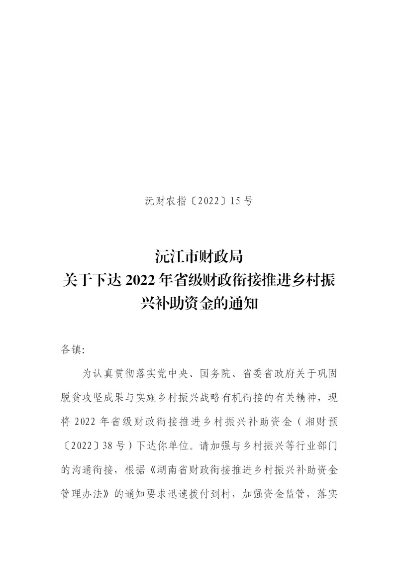 沅财农指〔2022〕15号 沅江市财政局关于下达2022年省级财政衔接推进乡村振兴补助资金的通知.pdf