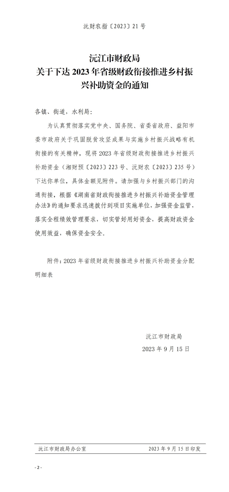 沅财农指〔2023〕21号沅江市财政局 关于下达2023年省级财政衔接推进乡村振兴补助资金的通知