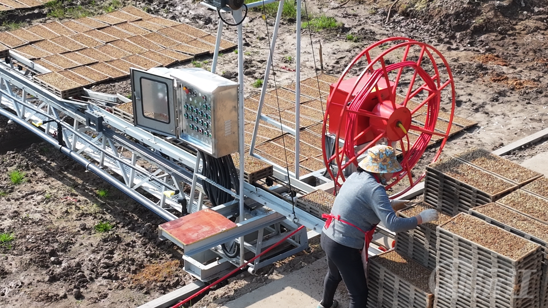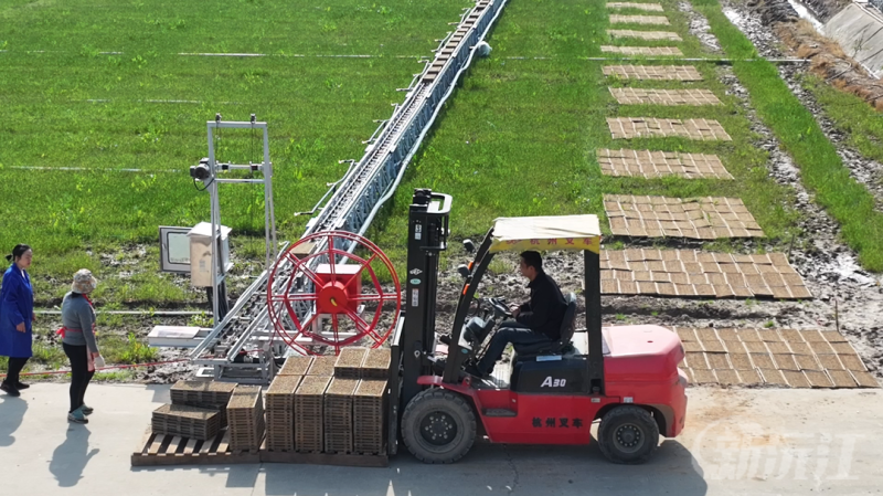 农业技术推广研究员程乐根表示:“我们在‘天车’上安装了整套喷淋系统,将原本的大水漫灌方式转变为天车轨道上的轨道喷淋。如此一来,能够有效减少水分对秧苗的损害,增强根系活力,提升秧苗素质。”