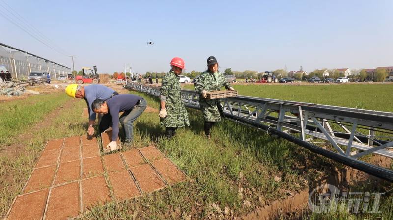 育苗车间外,8条银色轨道固定在百亩秧田中。搭载着喷淋系统的“天车”运输平台,正将催芽秧盘以每秒0.8米的速度精准投送至指定田块。农户陈双喜在育秧工厂工作已有数个年头,每年的早稻育秧时,她与其他农户一起在秧田里摆盘,用原来的秧盘运输流水线,秧田的芽床上只能摆放下四个秧盘,但现在有了这套田间物流系统,人工不仅减少了,工作效率还大幅提高,秧田的芽床上能够摆放五到六个秧盘,提高了秧田的利用率。