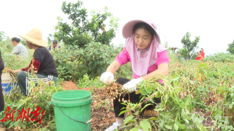 在蠡山村起伏的丘岗上,村民们穿梭在绿油油的枳壳树间,弯腰拨开花生藤,一手攥秧、一手轻抖,一把把带着果实的花生藤很快堆成小山。随后,大家再蹲坐在地头,把花生一颗颗采下,统一放入筐中。