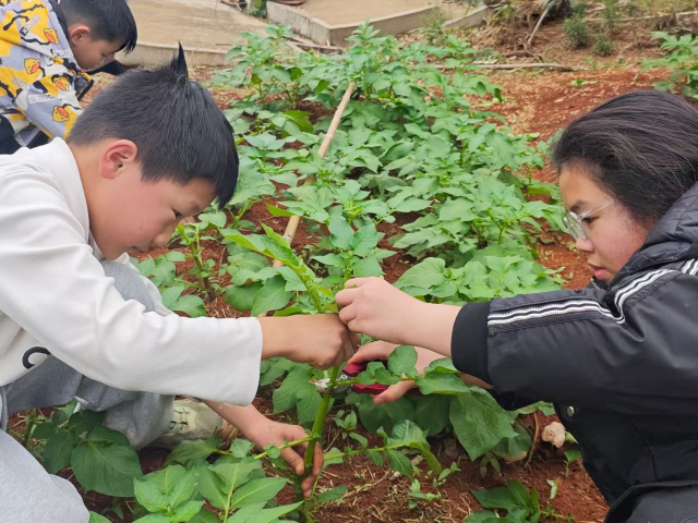 理论讲解结束后,同学们分组走进田间,在老师的指导下亲手实践。大家蹲在田埂上,小心翼翼地捏住土豆苗的顶端,用剪刀或手指轻轻掐断多余的枝蔓。有的同学初次操作略显生疏,在同伴和老师的鼓励下,很快掌握了力度与方法;有的同学互相配合,一人扶苗一人修剪,分工协作、有条不紊。阳光洒在红土地上,映照着孩子们专注的脸庞,田间回荡着清脆的笑声与交流声,一派生机勃勃的劳动景象。