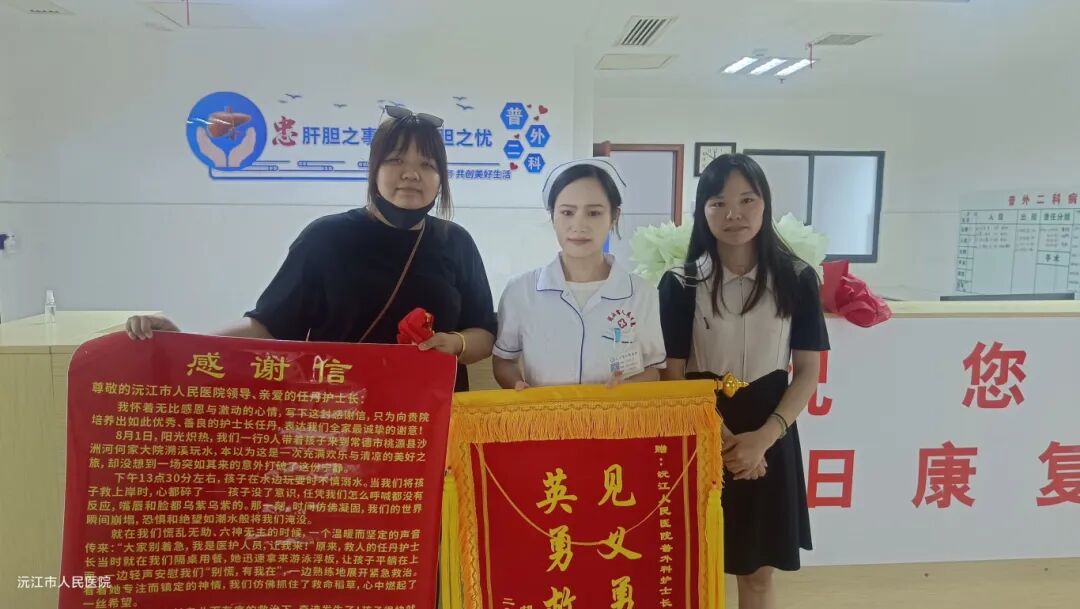 “如果不是任护士的果断施救,我的孩子可能就……”8月4日上午,来自湘潭的胡女士手捧锦旗、鲜花和感谢信,眼眶泛红地站在沅江市人民医院办公室门口,激动地寻找着那位救下她儿子的“白衣天使”——普外二科护士长任丹。