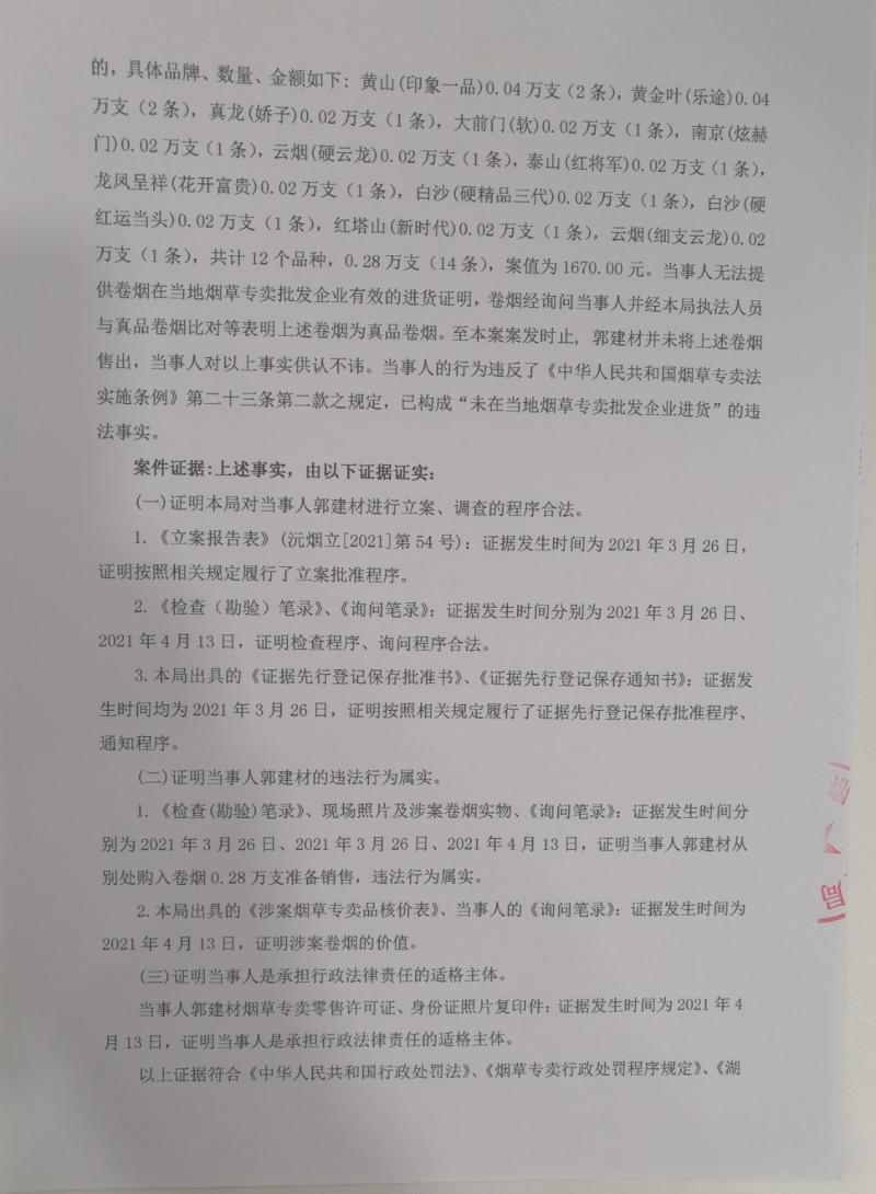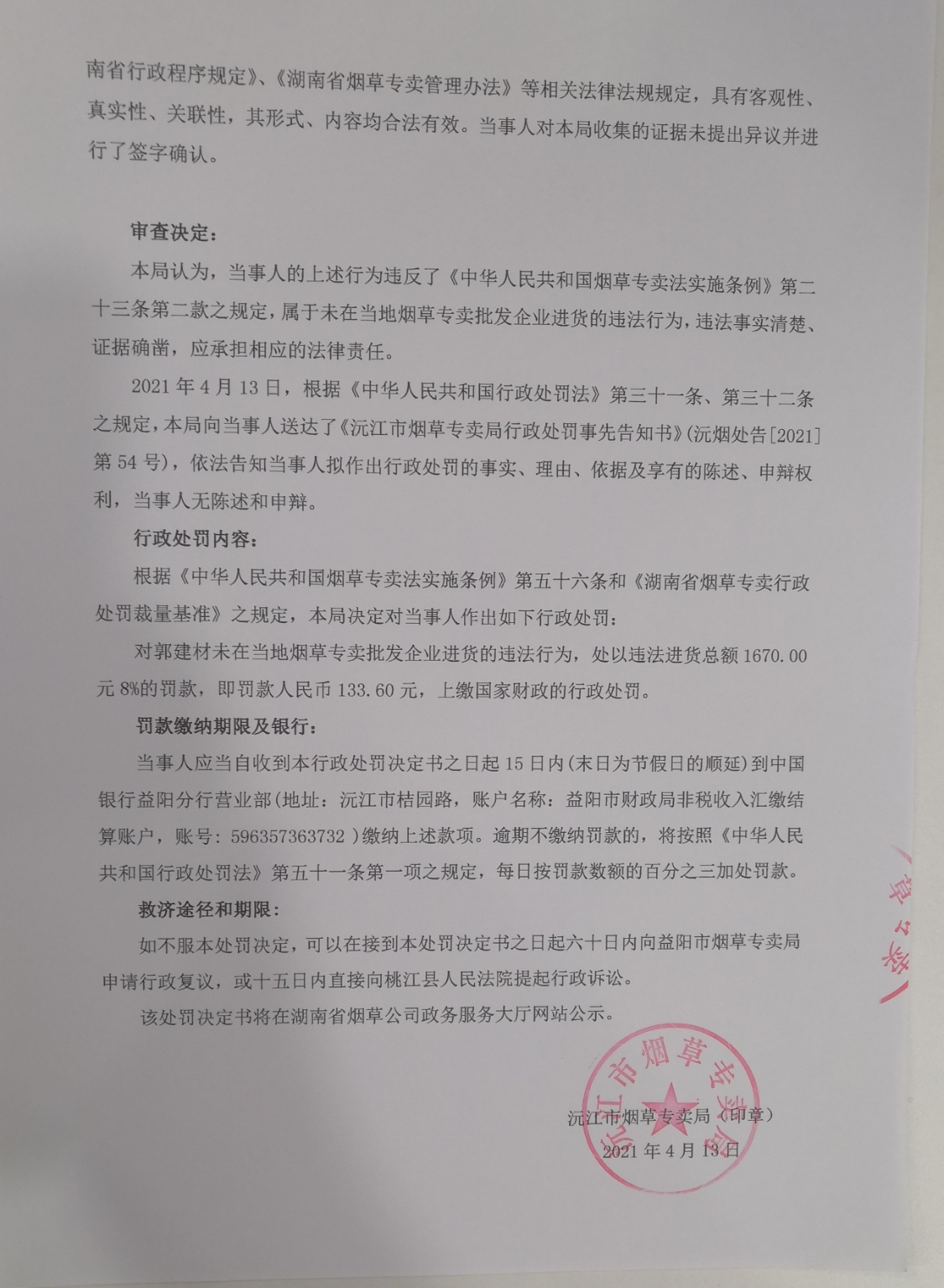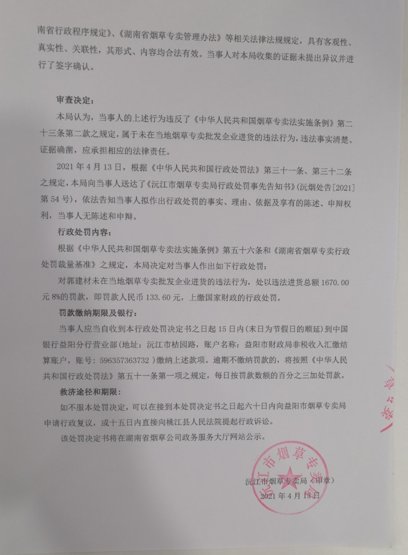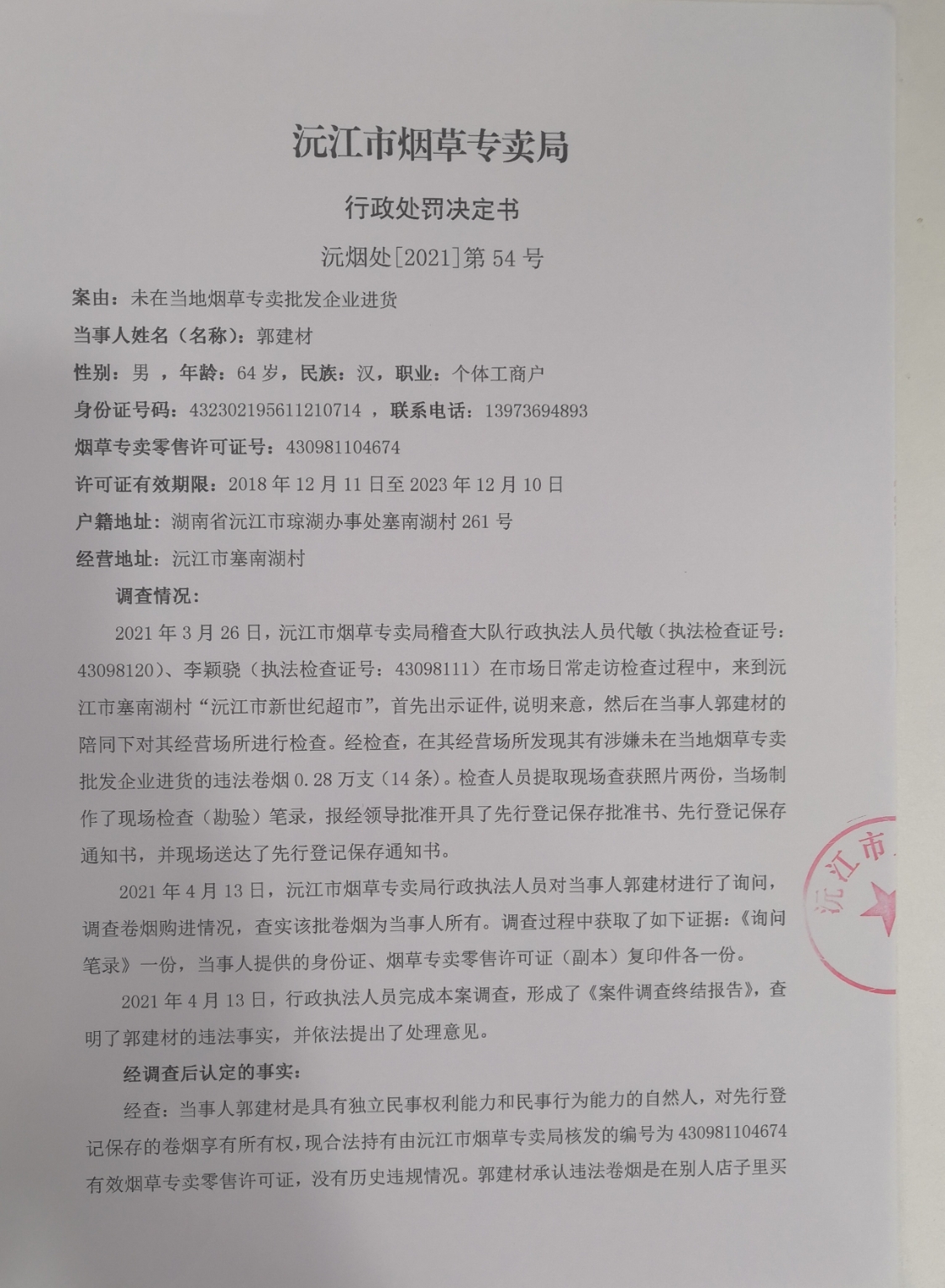 沅江市烟草专卖局行政处罚决定书沅烟处[2021]第54号