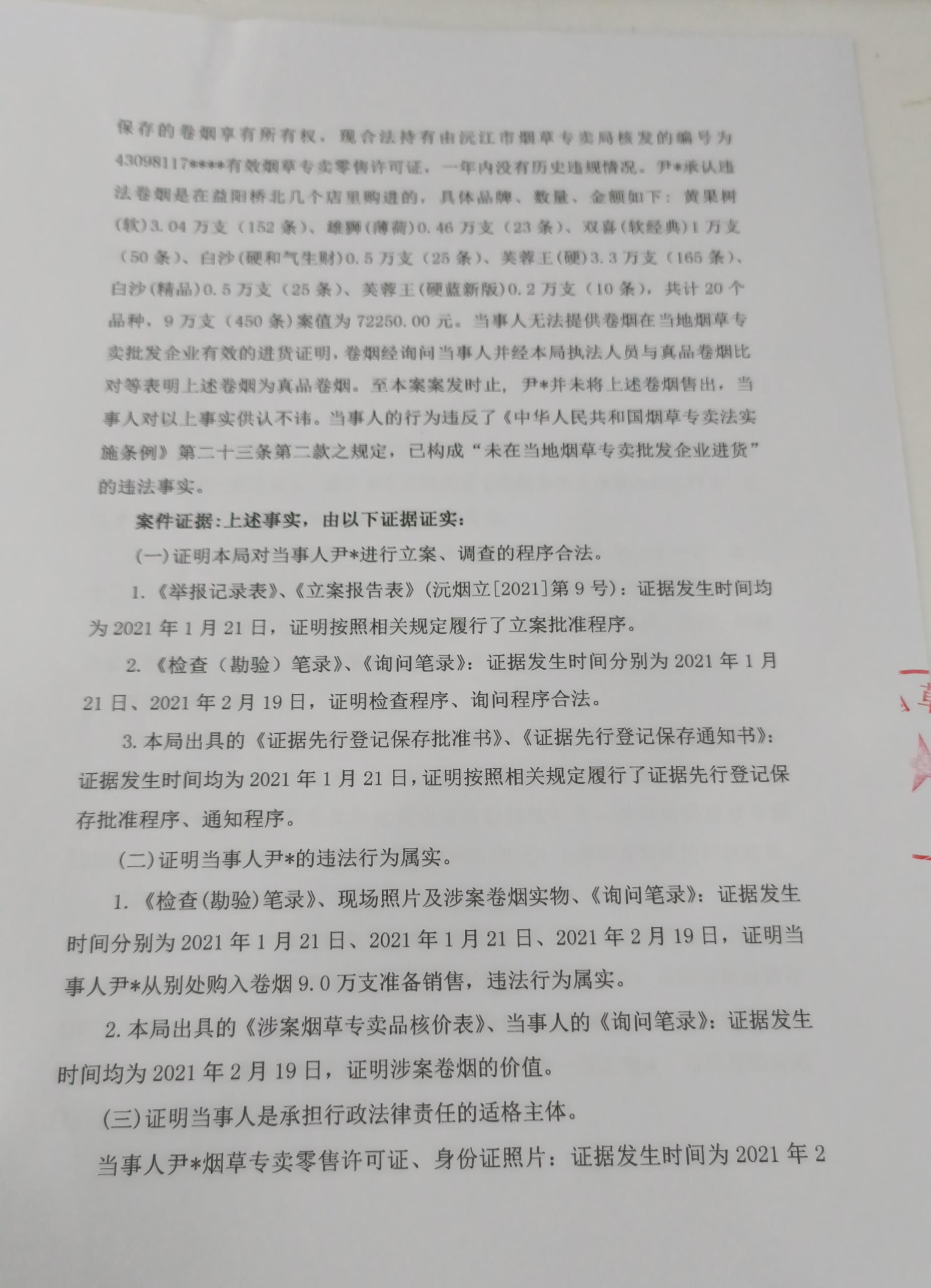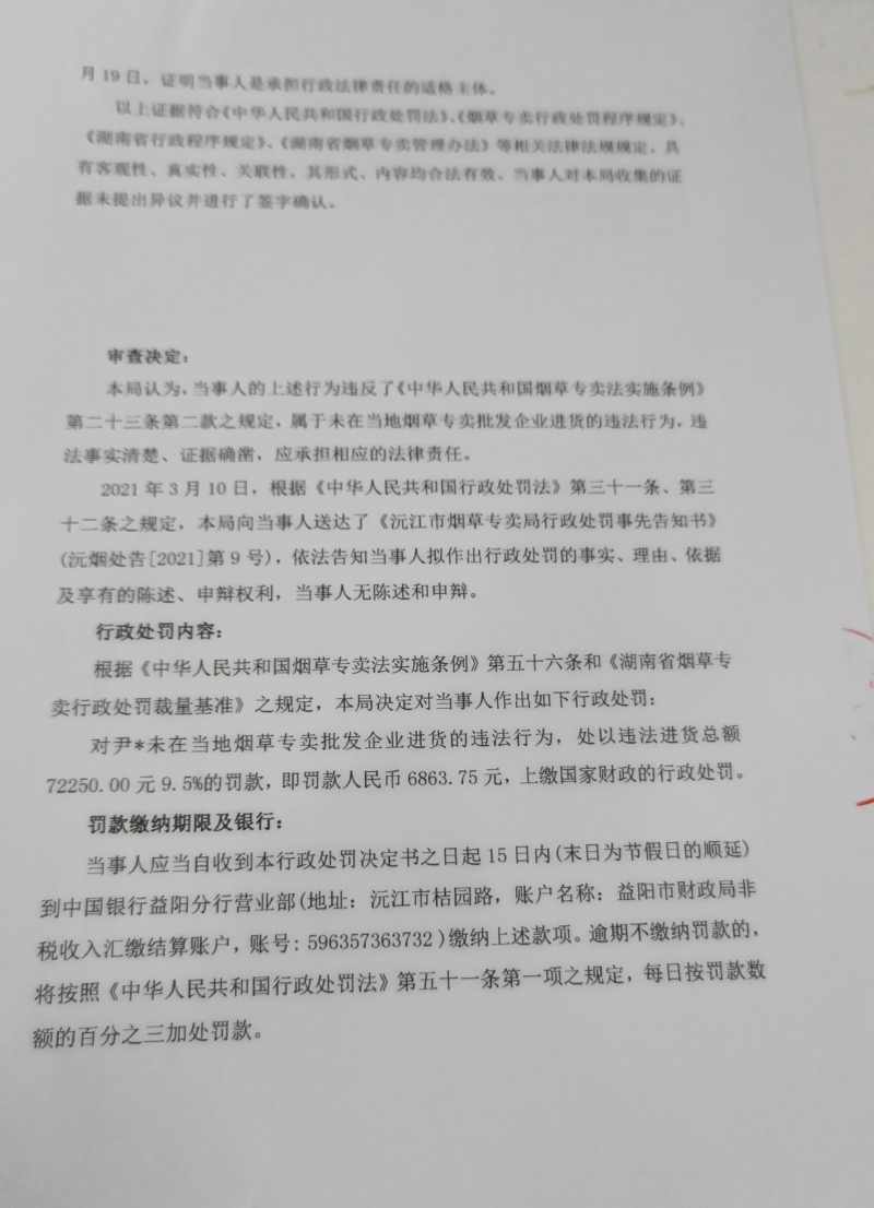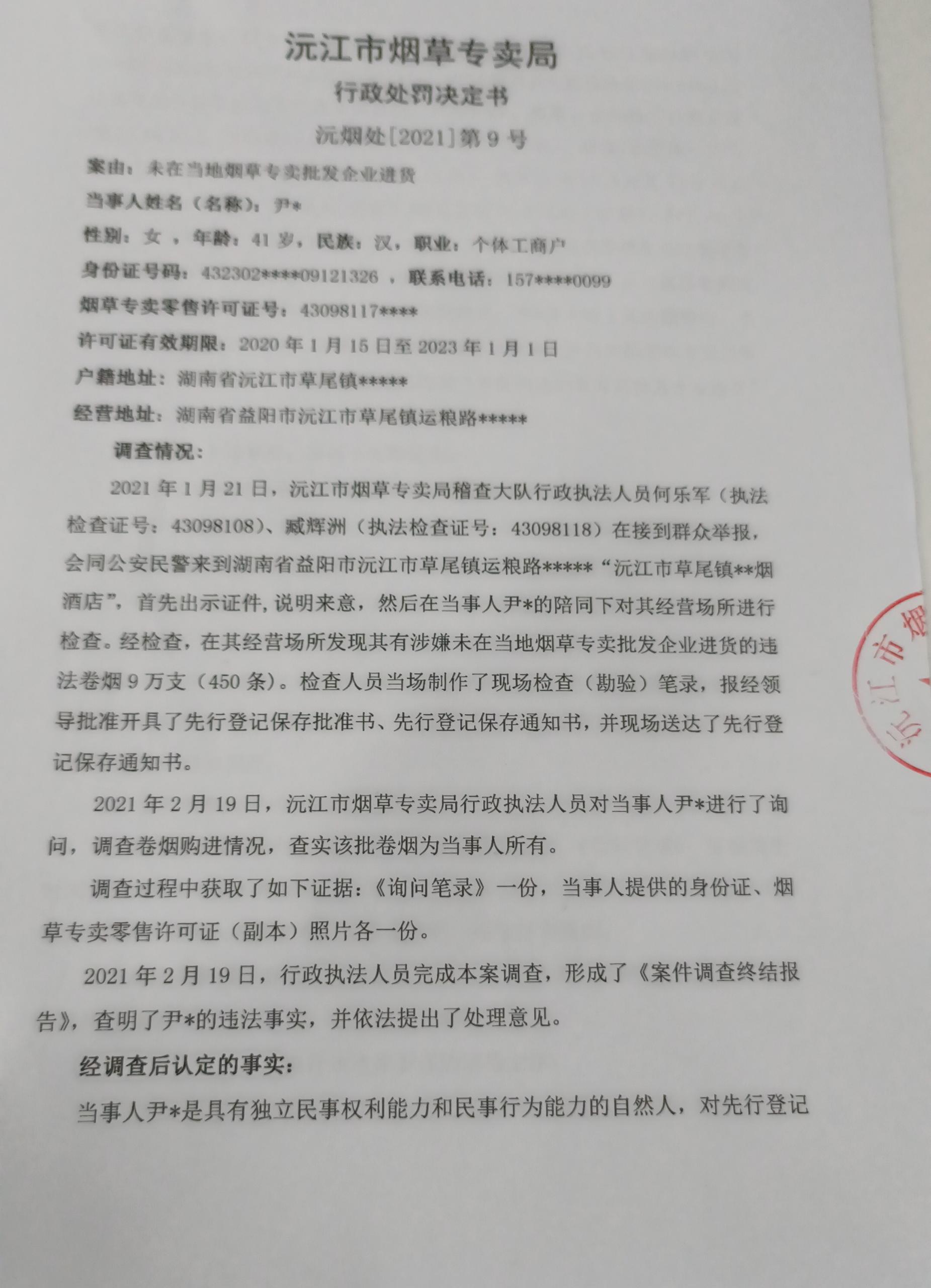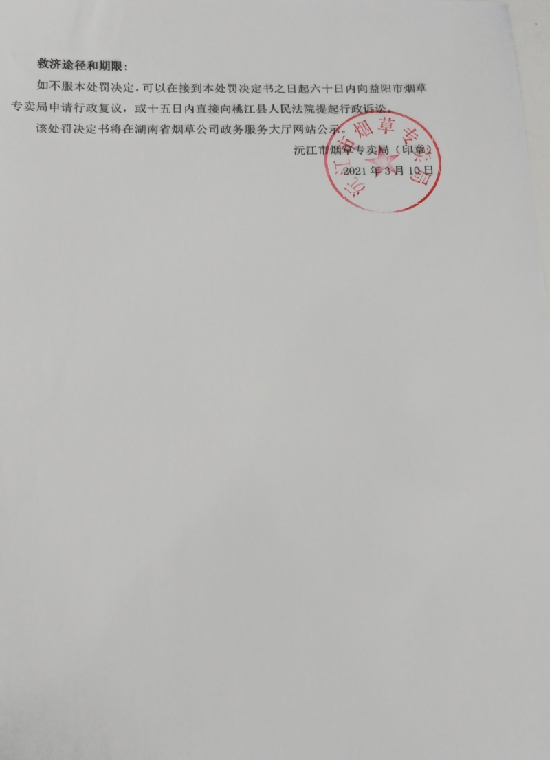沅江市烟草专卖局行政处罚决定书沅烟处[2021]第9号